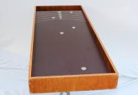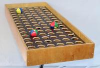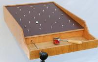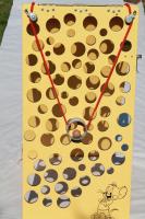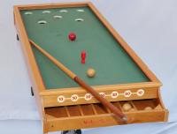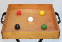Probeer met de keu de 4 houten balletjes 1 voor 1 in de gaten te stoten, waarbij de rode pion op zijn plaats moet blijven staan. Rolt de rode houten bal in een gat, dan telt deze dubbel.
