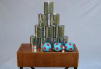Stapel de blikken op. Ga 3 meter voor het spel staan. Gooi de 3 ballen na elkaar naar de blikkentoren en probeer zoveel mogelijk blikken van de kist te gooien.