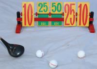 Probeer met de golfstok de bal richting het scorebord te slaan, zodat de scorebordjes omklappen.