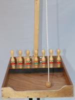 Richt op een kegel, laat de bal los en probeer zo een kegel om te gooien.
